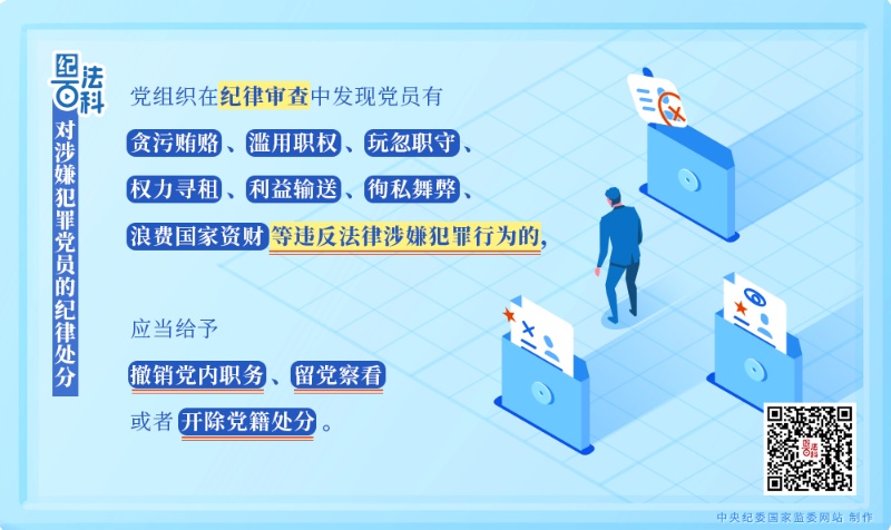 第二十九條規(guī)定,黨組織在紀(jì)律審查中發(fā)現(xiàn)黨員有貪污賄賂、濫用職權(quán)、玩忽職守、權(quán)力尋租、利益輸送、徇私舞弊、浪費(fèi)國(guó)家資財(cái)?shù)冗`反法律涉嫌犯罪行為的,應(yīng)當(dāng)給予撤銷黨內(nèi)職務(wù)、留黨察看或者開(kāi)除黨籍處分。