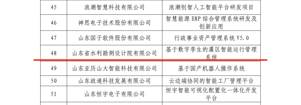 近日,山東省水利勘測(cè)設(shè)計(jì)院有限公司(以下簡(jiǎn)稱山東水設(shè))自主研發(fā)的“基于數(shù)字孿生的灌區(qū)智能運(yùn)行管理系統(tǒng)”成功入選“第五批山東省軟件產(chǎn)業(yè)高質(zhì)量發(fā)展重點(diǎn)項(xiàng)目”和“第九批山東省首版次高端軟件產(chǎn)品”,彰顯了公司在水利數(shù)字化領(lǐng)域的技術(shù)實(shí)力。