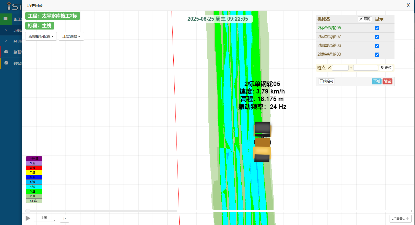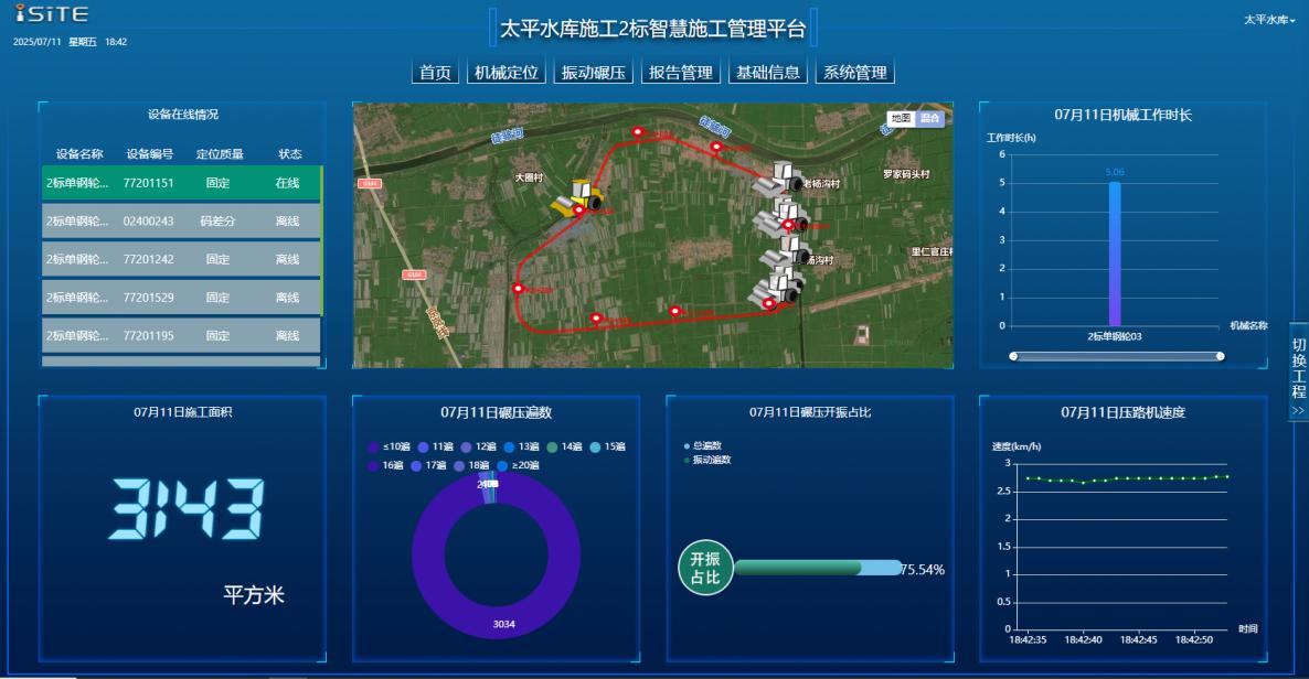 太平水庫碾壓施工智慧管控系統(tǒng),通過在碾壓機(jī)械上安裝北斗定位天線、VCV傳感器以及終端顯示平板,實時監(jiān)控碾壓機(jī)械的軌跡、速度、遍數(shù)、是否開振等指標(biāo),對攤鋪及碾壓進(jìn)行全過程數(shù)據(jù)采集、傳輸、統(tǒng)計分析、智能反饋和三維動態(tài)施工仿真模擬,并借助現(xiàn)場采集的施工參數(shù),對施工質(zhì)量進(jìn)行快速評價與控制。