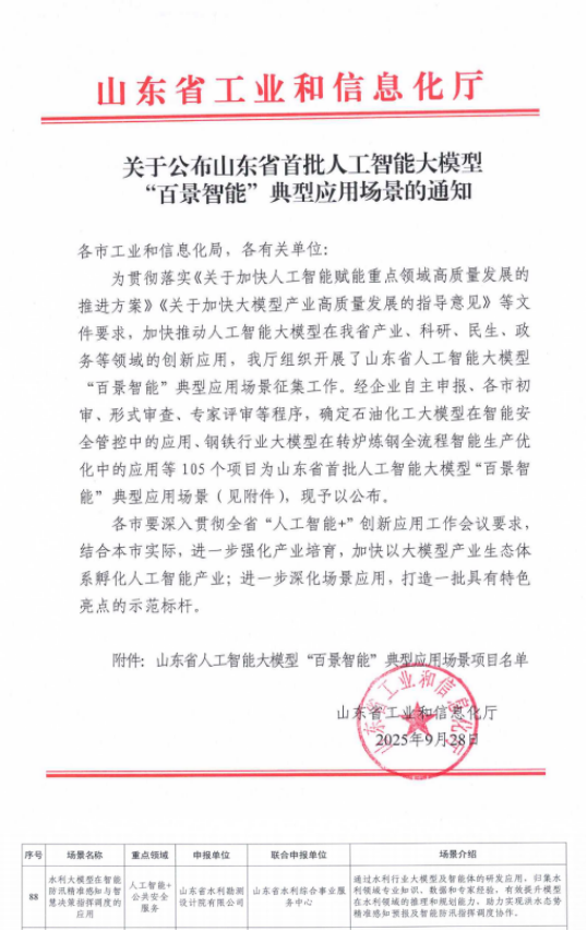 近日,山東省工業(yè)和信息化廳公布山東省首批人工智能大模型“百景智能”典型應用場景名單,由山東省水利勘測設計院有限公司(以下簡稱“山東水設”)聯合山東省水利綜合事業(yè)服務中心申報的“水利大模型在智能防汛精準感知與智慧決策指揮調度的應用”場景成功入圍。