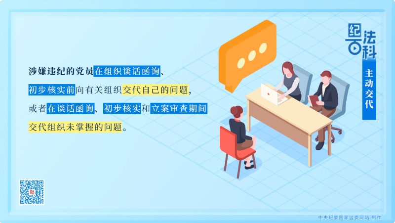 《中國共產(chǎn)黨紀律處分條例》第四十條規(guī)定:“本條例所稱主動交代,是指涉嫌違紀的黨員在組織談話函詢、初步核實前向有關組織交代自己的問題,或者在談話函詢、初步核實和立案審查期間交代組織未掌握的問題?!?/span>