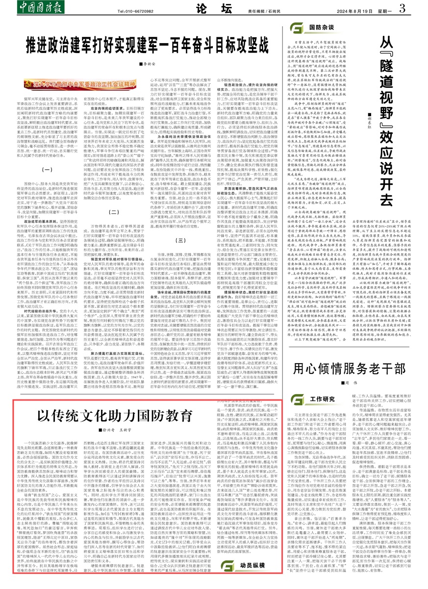 一個民族若缺少文化滋養(yǎng),就像鮮花失去陽光雨露,會逐漸枯萎;一種教育若缺乏文化底蘊(yùn),如同大廈沒有穩(wěn)固根基,必然會搖搖欲墜。國防文化作為文化的分支之一,是反映國防價值理念、知識體系和行為規(guī)范的特殊文化形態(tài),為國防教育提供思想保證、精神動力和智力支撐。深入推進(jìn)全民國防教育需要從中華優(yōu)秀傳統(tǒng)文化汲取豐厚滋養(yǎng),發(fā)揮好國防文化的育人功能作用,不斷提高全社會的國防素養(yǎng)。